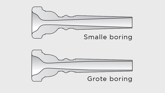 De boring van het mondstuk beïnvloed de ontwikkeling van het geluidsvolume in het instrument. Een smallere boring helpt met het halen van hoge noten op een instrument door meer weerstand. Verder klinkt het feller. Een grote boring helpt juist met het bereiken van lage tonen en klinkt donkerder.