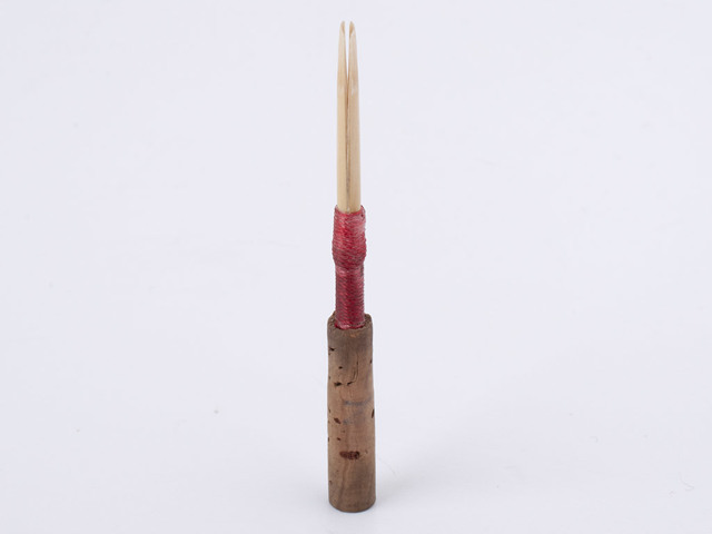- Het riet wordt met een touwtje aan de buis vastgebonden. Het uiteinde van het riet wordt afgeknipt. Dit wordt nu pas gedaan om de tip van het riet te beschermen. Dit raak je hierna ook niet meer met de handen aan.