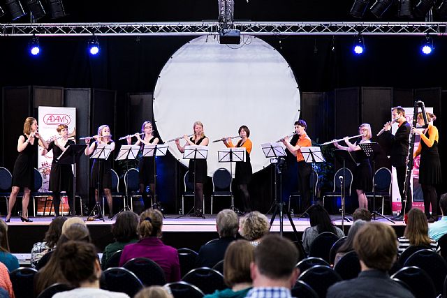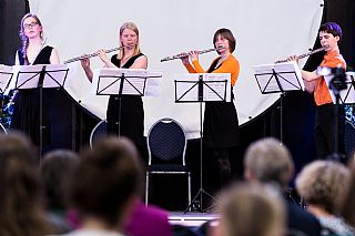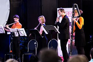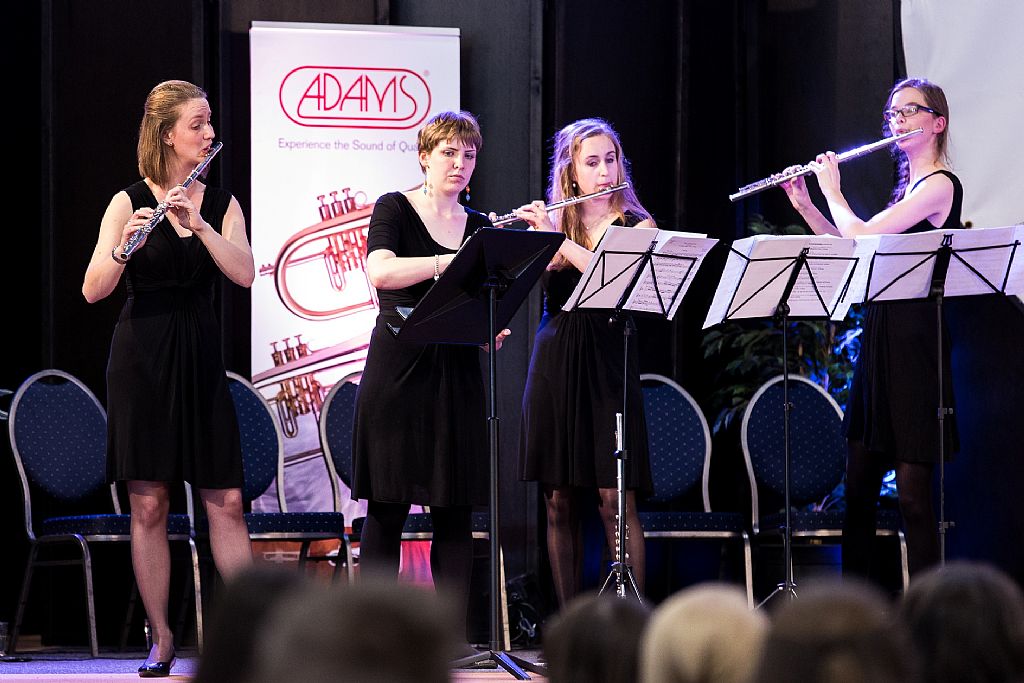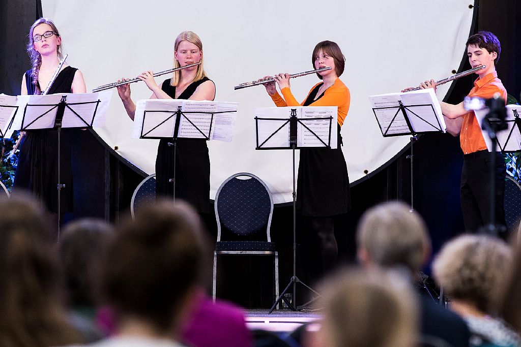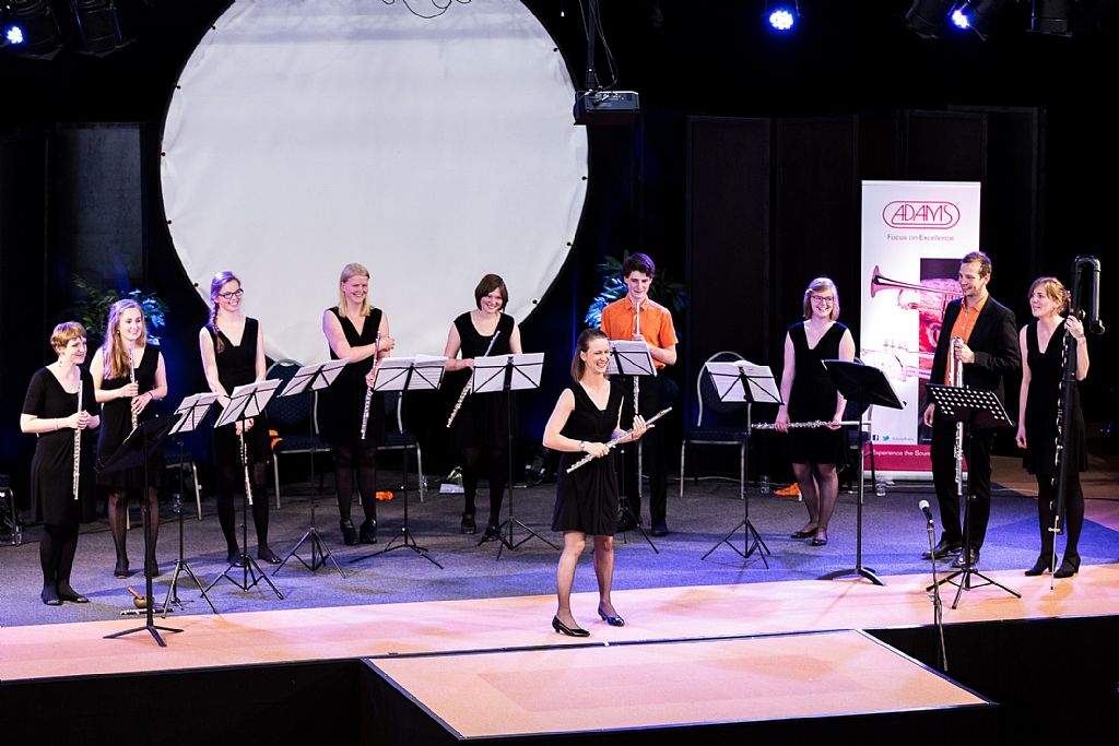 Het Neflac Ensemble speelt de finale van de tweede dag van het Fluitfestival, tijdens de prijsuitreiking van het Solistenconcours.