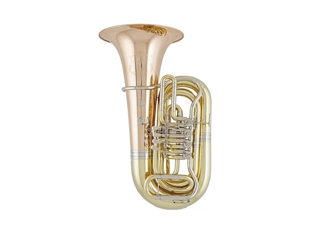 Bes Bastuba Lidl LBB 884-4GR, Moldau de Luxe, 4 cilinders, messing, goudmessing beker, trigger op 2de pomp, gravure, gelakt