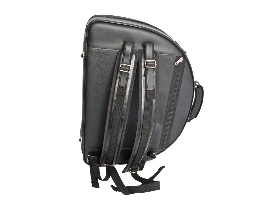 These Cases by Marcus Bonna are specifically designed for French horns. The case is made from a sturdy fiberglass shell covered in durable leather. The inside is covered with 1cm thick foam and a soft fabric lining. A French horn will fit perfectly with two belts, pouch for the bell and 2 modular blocks.