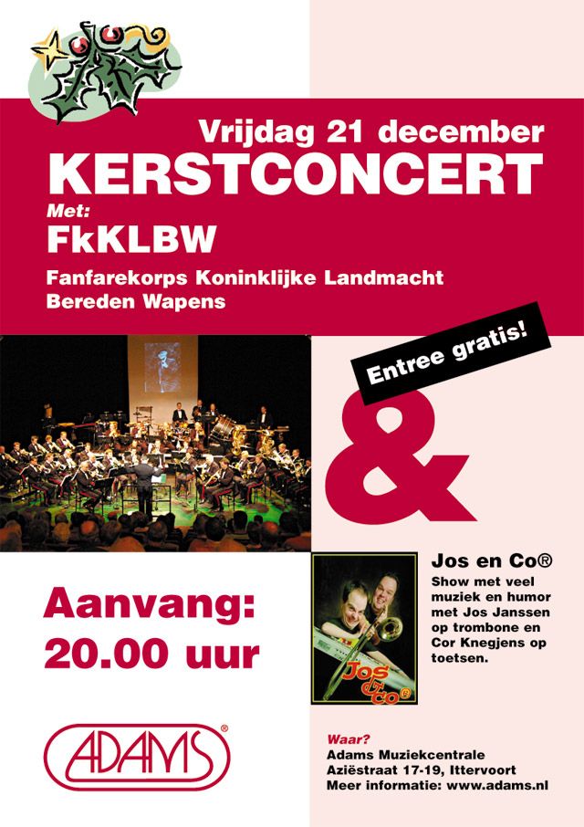 21 december werd een sfeervol Kerstconcert gegeven door Fanfarekorps Koninklijke landmacht bereden Wapens. Als kerstgeschenk naar al onze relaties, verenigingen en muzikanten organiseerde Adams Muziekcentrale een heus kerstconcert.