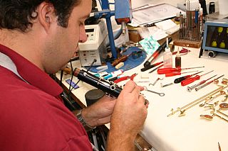 Tot slot spreken we over revisies. Frans: “We werken daarbij het liefst met de originele materialen. Dus als iets vervangen moet worden, dan doen we dat in principe met iets van hetzelfde merk als wat er op zit: dezelfde polsters, dezelfde kurken, zelfs dezelfde polsterlijm. Maar als iemand specifiek iets anders erop wil hebben, dan kan dat natuurlijk ook. Onze voorkeur is echter wel om te kiezen voor het origineel, want op die manier krijg je het instrument weer in de staat waarin het verkeerde toen je het voor het eerst uitzocht. Als je ander materiaal gaat gebruiken, dan gaat het instrument anders resoneren en krijg je dus een ander geluid dan hoe het klonk toen je dat instrument uitkoos. Dit kan wel betekenen dat bij ons de revisie misschien wat duurder is, maar je krijgt het instrument dan wel in die beginstaat weer terug. Veel mensen realiseren zich niet en zelfs vakmensen zijn zich er niet altijd van bewust dat ander materiaal een ander klankspectrum ten gevolg heeft.”