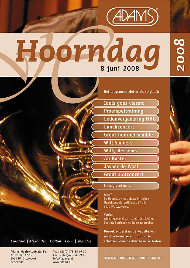 8 juni jongstleden vond de eerste Adams Hoorndag plaats. Het evenement werd in samenwerking met het Nederlands Hoorngenootschap georganiseerd. In 7 verschillende ruimten werd er gemusiceerd. Samenspeltrainingen, een lezing, Idols go Classic en een mooi slotconcert.