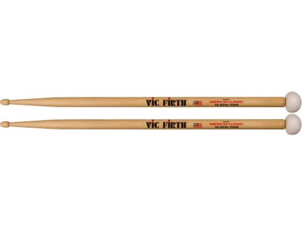 Vic Firth 5ADT, een 5A stok met een deglijke synthetische vilten bal op het einde. Ideal voor cymbal swells en een snelle wisseling naar warme drum klanken.