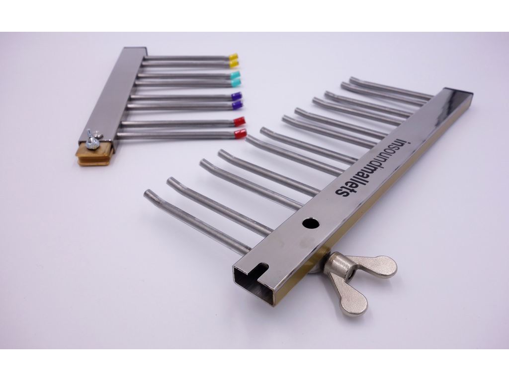 The pro consists of 2 smaller racks that when combined, create a bigger rack. The larger holder is made of 6 pairs of bristles for 6 pairs of mallets. The smaller rack for 4 pairs of mallets.