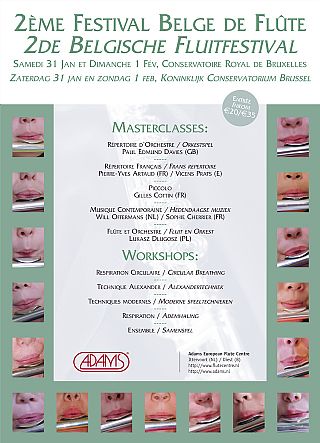 Aanvang: 10:30u Slotconcerten: Zaterdag 17:00u, Zondag 17:30u € 20,00 voor 1 dag € 35,00 voor beide dagen Inkom is inclusief deelname aan maximaal 3 Master Classes of Workshops per dag en bijwonen slotconcert. Master Classes: Piere-Yves Artaud (Fr) Wil Offermans (NL) Paul Edmund-Davies (GB) Gilles Cottin (Fr) Vicens Prats (E) Lukasz Dlugosz (Pl) Sophie Cherrier (Fr) Workshops: Ademhaling Alexandertechniek Circular Breathing Moderne Speeltechnieken