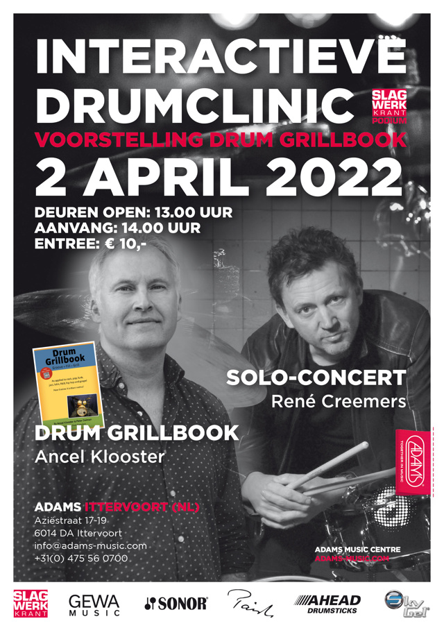 The Drum Grillbook is een nieuwe lesmethode geschreven door Ancel Klooster en Peter Deiman, twee Nederlandse slagwerkers. Op zaterdag 2 april zal Ancel het boek presenteren in de vorm van een interactieve clinic (+/- 45 min). Na de pauze is het de beurt aan niemand minder dan René Creemers solo. Topdrummer René Creemers, bekend van o.a. Drumbassadors, zal zijn nieuwe solo-programma presenteren.