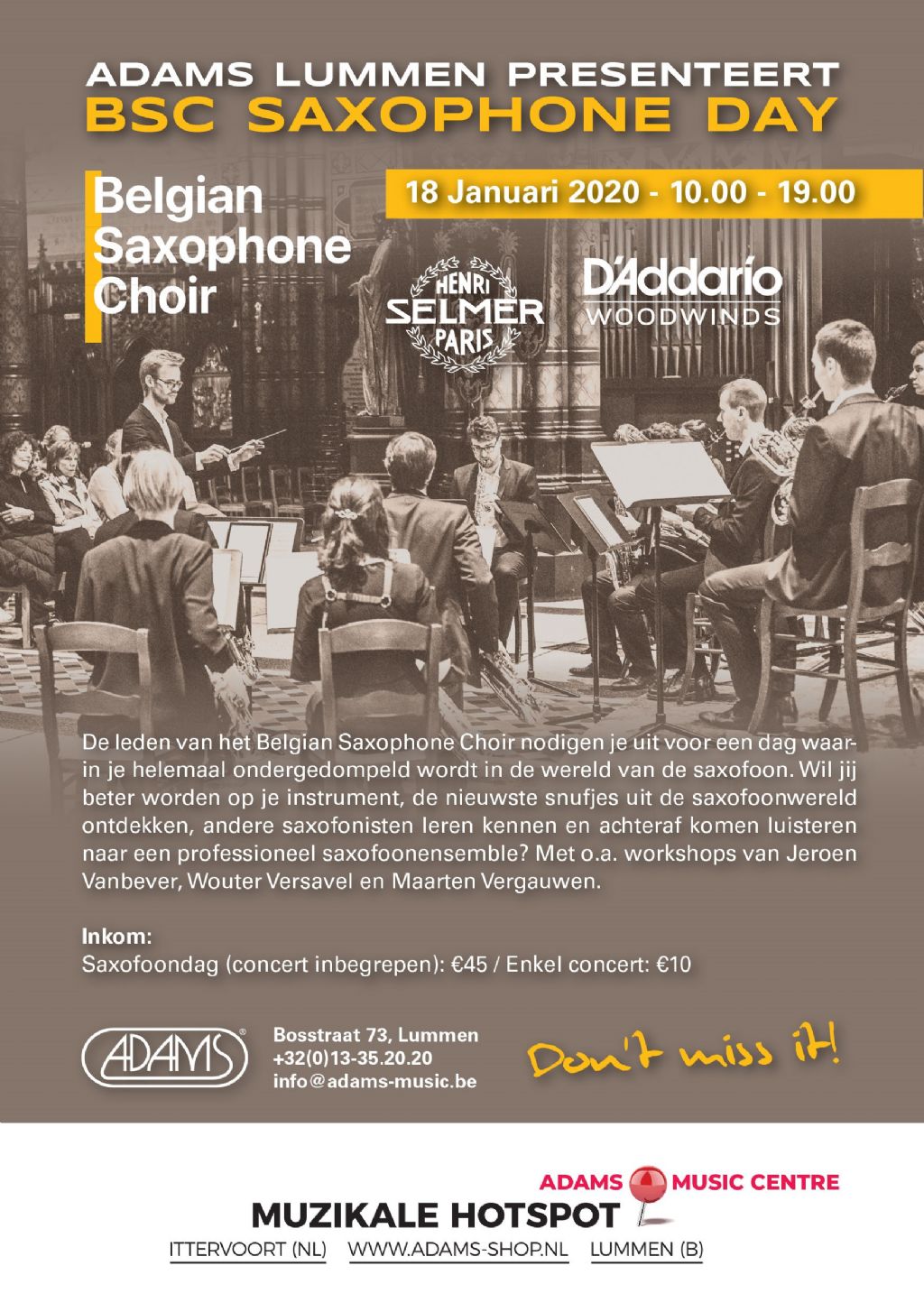 De leden van het Belgian Saxophone Choir - BSC nodigen je uit voor een dag waarin je helemaal ondergedompeld wordt in de wereld van de saxofoon. Wil jij beter worden op je instrument, de nieuwste snufjes uit de saxofoonwereld ontdekken, andere saxofonisten leren kennen en achteraf komen luisteren naar een professioneel saxofoonensemble? Schrijf je dan snel in voor een onvergetelijke dag! Inkom: Saxofoondag (concert inbegrepen): €45 Enkel concert: €10