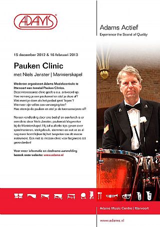 Pauken Clinic met Niels Jenster, Marinierskapel 16 februari 2013 Wederom organiseert Adams Muziekcentrale te Ittervoort een Pauken Clinic. Deze interessante clinic geeft u o.a. antwoord op: Hoe een paukenvel te vervangen en afstellen? Wat moet je doen als het pedaal gaat ‘lopen’? Wanneer zijn vellen aan vervanging toe? Hoe stem je de pauken en stel je de toonaanwijzers af? Na een rondleiding door de Adams Paukenfabriek en een lunch is er een clinic door Niels Jenster (paukenist/slagwerker bij de Marinierskapel). Hij geeft u allerlei tips over speelmanieren, stokgebruik, stemmen en wat er zo al nog meer komt kijken bij het bespelen van dit mooie instrument. Dagindeling: 9.30 uur – 10.00 uur ontvangst met koffie/thee 10.00 uur - 11.30 uur Pauken onderhoud en afstellen 11.30 uur - 11.45 uur Koffie met vlaai 11.45 uur - 12.45 uur Rondleiding Paukenfabriek 12.45 uur - 13.30 uur Lunch 13.30 uur - 14.30 uur Clinic Niels Jenster 14.30 uur - 14.45 uur Pauze 14.45 uur - 15.30 uur Clinic Niels Jenster DEELNAME: € 15,- p.p. (inclusief lunch)