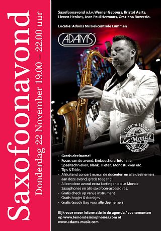 Donderdag 22 november bent u van harte welkom bij Adams Lummen voor een exclusieve saxofoonavond o.l.v. Werner Geboers. Ook Kristof Aerts, Lieven Henkes, Jean Paul Hermans en Graziana Buzzerio zullen erbij zijn. -Gratis deelname! -Focus van de avond: Embouchure, Intonatie, Speeltechnieken, Klank, Rieten, Mondstukken, ect etc. -Tips & Tricks -Afsluitend concert m.m.v. de docenten en alle deelnemers aan deze avond, gratis toegang! -Alleen deze avond extra kortingen op Le Monde Saxophones en alle saxofoon-accessoires. -Gratis check up van je instrument -Gratis hapjes & drankjes -Gratis Goody Bag voor alle deelnemers Kijk voor meer informatie in de agenda/evenementen op www.lemondesaxophones.com of www.adams-music.com