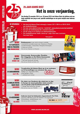 De spelregels: - Als klant bij Adams Diest ontvangt u tussen 25/11/2014 en 25/01/2015 een tombolanummer, - Ga naar www.adams-music.be/wedstrijd - Ga naar de tombolaprijs die u wenst te winnen, - Vul de vragen in en verstuur uw deelnameformulier, - Per tombolanummer heeft u kans op 1 prijs, hoe meer nummers, hoe meer kans.