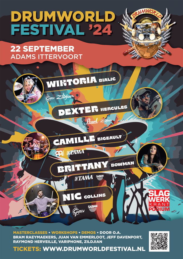 Het Drumworld Festival is een must voor elke drumliefhebber, met een line-up van de beste drummers ter wereld, inspirerende workshops en indrukwekkende optredens. Het is dé gelegenheid om je drumvaardigheden te verbeteren, nieuwe technieken te leren en te genieten van adembenemende drumclinics. Mis deze kans niet om deel uit te maken van een onvergetelijke ervaring en de levendige drummerscommunity. Ook dit jaar is het Drumworld Festival een officieel Slagwerkkrant Podium. Bestel nu je tickets en zorg dat je erbij bent op het grootste drumfestival van het jaar!