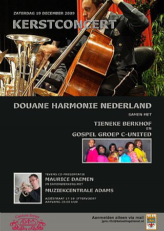 Aanvang is 20.00u en uiteraard is de entree gratis. Het concert zal worden verzorgd door de Douane Harmonie Nederland met medewerking van bugelsolist Maurice Daemen, Gospelgroep C-United en zangeres Tieneke Berkhof. CD-presentatie Tijdens het kerstconcert 2009 zal ook de officiële presentatie plaatsvinden van de CD en DVD uit de reeks “Passion in Sound” die Adams liet vervaardigen ter promotie van de Custom Series koperblaasinstrumenten. De CD bevat opnamen van 3 HaFaBra orkesten, te weten Harmonie L’ Union uit Heythuysen, Brassband Limburg en Fanfare Kempenbloei uit Achel met solistische medewerking van Maurice Daemen, Thieu Cosemans, Ramon Lormans en Roger Diederen. Bij deze release zit tevens een DVD: “The making of...” waarop getoond wordt hoe de Adams Custom bugel gebouwd wordt en hoe de CD tot stand kwam. Bezoekers aan het kerstconcert krijgen de CD en DVD tegen een gereduceerde prijs aangeboden. Douane Harmonie Nederland De Douane Harmonie Nederland werd opgericht in 1955 en is een semiprofessioneel muziekgezelschap van enthousiaste muzikanten, die bij de Douane en andere eenheden van de Belastingdienst werken, aangevuld met professionele musici. Muzikale taken liggen er op het gebied van representatieve optredens voor de Belastingdienst en daarnaast verzorgt de Douane Harmonie Nederland concerten, taptoes en treedt op bij diverse muzikale evenementen in binnen- en buitenland. De drumband van de harmonie treedt zowel samen met het orkest op alsmede zelfstandig als slagwerkensemble. Verder beschikt de Douane Harmonie Nederland over een dansorkest en combo. Tijdens het Adams Kerstconcert 2009 weet de Douane Harmonie zich gesteund door de medewerking van bugelsolist Maurice Daemen, sopraan Tieneke Berkhof en Gospelkoor C-United. Solist Maurice Daemen Maurice Daemen studeerde aan het Maastrichts’ Conservatorium de vakken Bugel en Orkestdirectie. In de loop van de jaren volgde hij lessen bij Theo Wolters, Rudiger Baldauf en Frits Damrow. Als bugelsolist is hij met regelmaat te gast bij diverse Hafa-orkesten en is hij te beluisteren op een aantal CD opnamen met diverse orkesten, zoals het Brabants Fanfare Orkest, Brass Band Limburg en fanfare Eendracht Baarlo. Sinds 1993 is Maurice actief als dirigent bij diverse orkesten en bewerkte in die hoedanigheid diverse werken voor fanfare- en harmonieorkest. Met enige regelmaat is hij als dirigent te gast bij HAFA verenigingen; zo dirigeerde hij ondermeer concerten met het provenciaal harmonie-orkest Symphonic Impulse, 3-voudig WMC kampioen Concertdivisie, Fanfare Eensgezindheid uit Maasbracht en de Noord Limburgse BrassBand te Eksel (B). Momenteel is hij dirigent van fanfare’s in Ittervoort, Urmond en Dieteren en, allen uitkomend in de 1e divisie. Sinds het najaar 2007 speelt Maurice exclusief op een speciaal model Adams bugel en verzorgt hij, in samenwerking met Adams Muziekcentrale, workshops en concerten als bugelsolist in den lande. Gospelkoor C-United C-United, het popgospelkoor dat furore maakte in de X-factor 2009. Eric van Tijn liet de 6-koppige formatie niet doorgaan naar de live shows, omdat ze, volgens hem, eigenlijk te goed was en er geen groei meer werd verwacht. Dat Eric het mis had, blijkt uit het feit dat de groep met haar liveshows nog dagelijks progressie maakt, wat niet onopgemerkt is gebleven gezien de vele aanvragen voor optredens in het land en bij radio- en TVprogramma’s. Sinds de groep meedeed aan de X-factor is haar naam vaak gevallen bij programmamakers en heeft ze inmiddels opgetreden in o.a. Life & Cooking en Raymann is laat. Alhoewel C-United door het tv-programma X-factor landelijke bekendheid verwierf, is ze in gospelland niet geheel onbekend. Ze stond al eerder in het voorprogramma van bekende gospelartiesten als Papa San, Andrae Crouch, Yolanda Adams en Fred Hammond. Maar C-United is meer dan gospel. Ze maakt swingende gospel met popinvloeden, waardoor het niet alleen enorm swingt maar ook heel herkenbaar is.