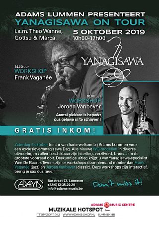 Zaterdag 5 oktober bent u van harte welkom bij Adams Lummen voor een exclusieve Yanagisawa Dag. Alle nieuwe WO- modellen in diverse uitvoeringen zullen beschikbaar zijn (Sterling Silver, brons...) in de grootste voorraad ooit. Deskundige uitleg krijgt u van Yanagisawa-specialist Wen De Backer. Tevens zijn er workshops door niemand minder dan Frank Vaganée (jazz) en Jeroen Vanbever (classic). Deze workshops zijn interactief, breng je sax dus mee. Gratis inkom, wel even inschrijven aub.