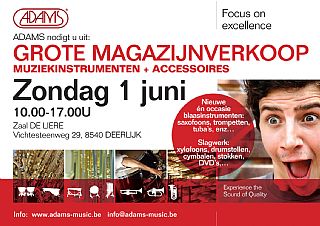 Op zondag 1 juni organiseren we een grote magazijnverkoop, en dit op verplaatsing: in DEERLIJK, nabij Kortrijk kunt u uw slag doen op toonzaalmodellen, beschadigde instrumenten en accessoires, occasie instrumenten, overstock, enz. Kom zeker langs, het is de moeite! Deze magazijnverkoop gaat door in Zaal DE LIERE, Vichtesteenweg 29 in 8540 DEERLIJK. Ziehier enkele van de vele aanbiedingen: Gelieve ons even te bellen of mailen indien u een instrument wil RESERVEREN!!! 013/35.20.20, [email protected] SAXOFOONS Saxofoon Sopraan Selmer SA80II VG, gelakt, met gravure Instr.Nr. N599049 Van € 4.067 Voor € 3.000,- Saxofoon Sopraan N.Y.S. Serie III, met rechte en gebogen hals, lak Instr.Nr. 21140406 Van € 1.125,- Voor € 700,- Saxofoon Sopraan Prologue 560-L, lak Instr.Nr. 2007466 Van € 1.158,- Voor € 750,- Saxofoon Bariton N.Y.S. Serie III, verzilverd met gelakte kleppen Instr.Nr. 6057359 Van € 3.757,- Voor € 2.850,- Saxofoon Bariton Selmer Serie III VG, lak, met gravure Instr.Nr. 728756 Van € 9.965,- Voor € 7.950,- Saxofoon Alt Yanagisawa Japan Mod. A901, Lak Instr.Nr 00328007 Van € 2.000,- Voor € 2.619,- Saxofoon Alt Selmer Reference, gold Instr.Nr. 757365 Van € 5.219,- Voor € 4.000,- Saxofoon Alt N.Y.S. Serie V, lak Instr.Nr. 21011415 Van € 1.115,- Voor € 850,- Saxofoon Tenor N.Y.S. Serie III, lak Instr.Nr. 1046381 Van 1.063,- Euro Voor 700,- Euro Saxofoon Tenor Yanagisawa T901, goudlak Instr.Nr. 00327065 Van 2.992,- Euro Voor 2.250,- Euro KLARINETTEN Klarinet A Buffet Crampon E11, 17/6, hout-zilver Instr.Nr.776437 Van € 1.297,- Voor € 1.000,- Klarinet Bes Yamaha CSV, 17/6, hout-zilver, Custom Serie Instr.Nr.001013 Van € 3.003,- Voor € 2.400,- Klarinet Bes N.Y.S. kunststof, vernikkeld Instr.Nr. 52454 Van € 450,- Voor € 575,- DWARSFLUITEN Dwarsfluit Pearl 665E-1R, verz., gesl. Kl., volzilveren kopstuk Instr.Nr. 18465 Van 1.101,- Euro Voor 820,- Euro Dwarsfluit Altus 1207 E/RE, volzilver, open kleppen, E-mech Instr.Nr. 6980 Van 6.596,- Euro Voor 5.500,- Euro Dwarsfluit Sonare SF55BEF verz., open kl., B-voet, zilver Powell kopst. Instr. Nr. 40148 Van 1.617,- Euro Voor 1.300,- Euro KLEIN KOPER Bugel Bach 200, Verzilverd Instr.Nr. C95672 Van 2.020,- Euro Voor 1.320,- Euro Bugel Stomvi Elite, verzilverd Instr.Nr. 0422907 Van 2.348,- Euro Voor 1.600,- Euro Bugel Manchester Brass, 500 series, Goldbrass beker, lak, trigger Instr.Nr. 2707 Van 737,- Euro Voor 650,- Euro Cornet Bes Manchester Brass, goldbrass beker, lak, trekking koffer Instr.Nr. 112111 Van 595,- Voor 495,-Euro Hoorn Bes A Hoyer 704, messing, enkelhoorn, lak Instr.Nr. 410091 Van 2.575,- Euro Voor 1.999,- Euro Trompet Bes King 601W, lak Instr.Nr. 590042 Van 847,- Euro Voor 650,- Euro Trompet Bes Holton ST-307 M.Ferguson-Horn,lak Instr.Nr. 225921 Van 2.645,- Euro Voor 2.000,- Euro Trompet Bes Jupiter 606, lak Instr.Nr. 07704 Van 636,- Euro Voor 450,- Euro GROOT KOPER Euphonium Besson BE1065, Student, 4 ventielen, verzilverd Instr.Nr. 1031200 Van 1.668,- Euro Voor 1.300,- Euro Trombone (Tenor) Bach LT42G, lichtgwschf., 8,5" goldbr., gelakt Instr.Nr. 178467 Van 3.678,- Euro Voor 3.000,- Euro Trombone (Tenor) King 3B, .508 boring, lak Instr.Nr. 206400 Van 2.565,- Euro Voor 2.000,- Euro Trombone (Tenor) Yamaha YSL630, Medium Large, messing beker, Instr.Nr. 21415360 Van 1.990,- Euro Voor 1.600,- Euro Tenorhoorn (Alto) Roy Benson AH-101, Student Serie, gelakt Instr.Nr. A336 Van 630,- Euro Voor 535,- Euro SLAGWERK Universal pauken 26"+29" fiber met hoezen, stokken, dempers Van 2.490,- Euro Voor 1.850,- Euro Professional 2nd-generation (ii) pauken 23 + 26 +29 + 32" koper met hoezen, stokken, enz. Van 16.462,- Euro Voor 11.500,- Euro Concert Bassdrum Free Suspended 32" x 18" met hoes en mallet Van 1.996,- Euro Voor 1.390,- Euro Concert Bassdrum met vaste bevestiging 28" x 18" Van 1.212,- Euro Voor 850,- Euro Xylofoon Solist oktaafstemming LR Voyager 3.5 okt Van 1.412,- Euro Voor 1.050,- Euro Marimba Solist MSPV43, 4 1/3 okt. a2-C7, padouk 58-40 mm Van 3.231,- Euro Voor 2.300,- Euro Tam-tam Wuhan 32” Van 770,- Euro Voor 524,- Euro Tam-tam Wuhan 32” Van 670,- Euro Voor 410,- Euro Buisklokkenspel standaard model (BK2001) 1.5 okt (C5 t/m F6) Van 6.128,- Euro Voor 4.100,- Euro Cymbalsets : Paiste 2002 set : van € 1168 voor € 750 Paiste PST 8 set : van € 521 voor € 399 Paiste 201 set : van € 334 voor € 225 Paiste PST 5 set : van € 435 voor € 300 Paiste PST 5 set : van € 435 voor € 300 Paiste Alpha Swiss set : van € 722 voor € 499 Cymbals : Diril 16” Traditional Thin Crash : van € 172 voor € 120 Diril 20” AD Ride : van € 233 voor € 150 Diril 20” Traditional Ride : van € 233 voor € 150 Diril 21” Jazz Ride : van € 253 voor € 160 Diril 18” Agressive China : van € 193 voor € 120 Diril 18” Jazz Crash : van € 192 voor € 120 Diril 21” AD Ride : van € 253 voor € 160 Diril 16” AD Crash : van € 172 voor € 120 Diril 14” Shiny Hi-Hat : van € 253 voor € 160 Cymbals 2de hands : Sabian HH 18” Crash : € 100 Sabian Carmine Appice 16” China : € 100 Sabian Jack De Johnette 20” China : € 100 Bongo’s : Adams Platinum Green : van € 198 voor € 99 Adams Platinum Green : van € 198 voor € 99 Adams Platinum Red : van € 198 voor € 99 Adams Platinum : van € 198 voor € 99 Drums : Adams 8000 Purple Acryllic 6-delige demo Shell set : van € 3045 voor € 1500 Adams 8000 Silver Sparkle Black Racing Stripe 6-delige demo Shell set : van € 3045 voor € 1750 Cajon : Cajon Tycoon KXRB-29 Blue Acryllic : van € 413 voor € 275