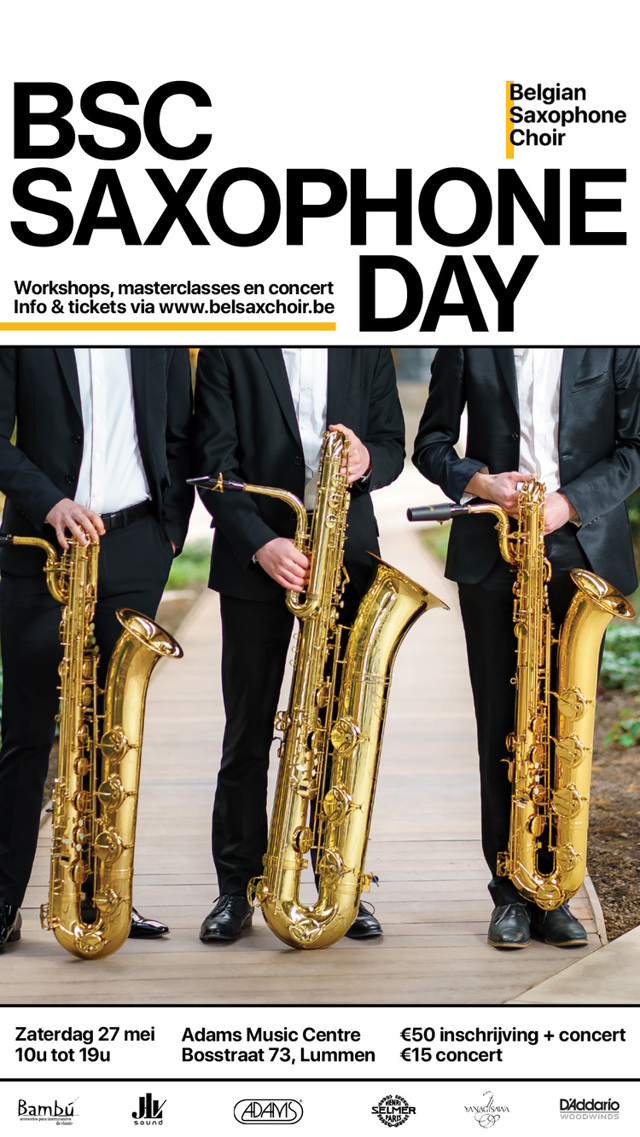 De leden van het Belgian Saxophone Choir nodigen je uit op 27 mei 2023 voor de BSC Saxophone Day te Adams, Lummen!