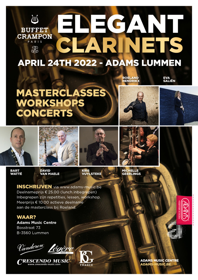 Adams Lummen organiseert op 24 april ELEGANT CLARINETS met Roeland Hendrikx, Bart Watté, Eva Saliën, David Van Maele, Michèlle Geerlings en Kris Vuysteke!