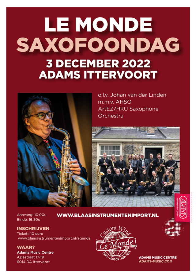 Le Monde Saxophones en Adams Music Centre organiseren op zaterdag 3 december een Saxofoondag in Ittervoort.