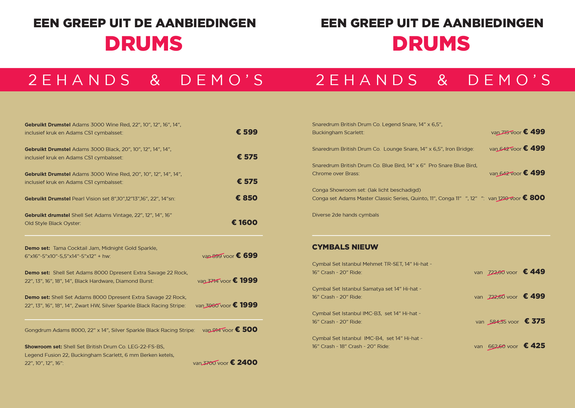 Tientallen slaginstrumenten, licht beschadigde, demonstratiemodellen, eindereeksmodellen, occasies, diverse accessoires, enz. zullen verkocht worden in onze pop-up store in Ruiselede (West-Vlaanderen) tegen sterk verminderde prijzen! Ook zijn er heel wat aanbiedingen voor nieuwe slaginstrumenten en accessoires.