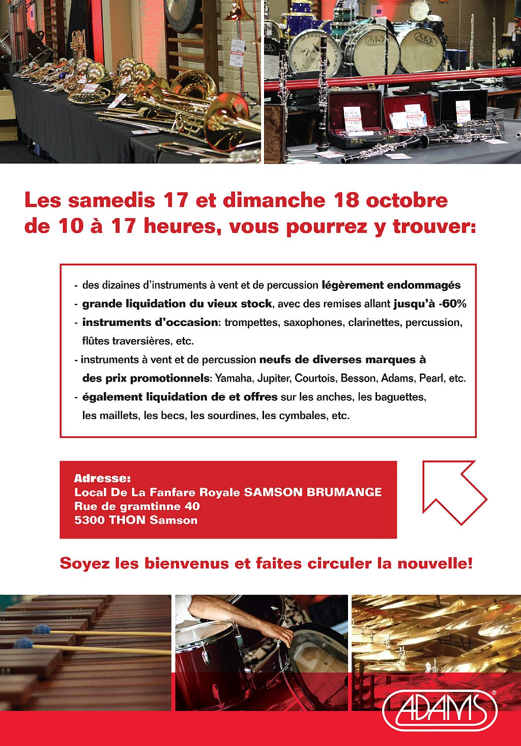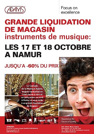 JUSQU’A -60% DU PRIX La Centrale de la Musique Adams, magasin spécialisé en instruments à vent et en percussion, se rend à Namur et vous invite à sa grande liquidation de magasin les samedi 17 et dimanche 18 octobre de 10 à 17 heures, vous pourrez y trouver: