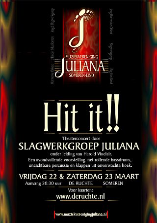 Rollende bassdrums, onzichtbare percussie en klappen uit onverwachte hoek. Het is slechts een greep uit het programma dat Slagwerkgroep Juliana uit Someren-Eind met de voorstelling Hit It!! op 22 en 23 maart 2013 in Cultureel Centrum De Ruchte op de planken gaat brengen. Dat slagwerkmuziek al lang niet meer alleen uit trommels, stokken en volume bestaat gaat de groep met zijn derde avondvullende show opnieuw bewijzen. De vorige twee edities stonden garant voor uitverkochte zalen, met lovende reacties van een breed publiek. Slagwerk samen met humor en muzikale souplesse, in de meest overtreffende trap van veelzijdigheid. Wie zich hier een beeld van wil vormen moet zich de acts van leden van de slagwerkgroep op de zanikavonden in Someren-Eind voor de geest halen. De hilariteit van deze optredens afgewisseld met schitterende slagwerkmuziek, gecombineerd met een naadloos doorlopende show: voilà, uw perfecte voorstelling! Kaarten á € 10,- zijn te koop via de website van De Ruchte, www.deruchte.nl. of mail naar Koen Tomassen, [email protected].
