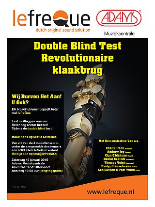 Showkorps Pasveer uit Leeuwarden te gast bij Adams tijdens de Double Blind Test van LefreQue. Op zaterdag 10 januari 2015 om 19:00 uur vindt er voor het eerst in de geschiedenis van de blaasmuziek een Double Blind Test plaats. Hierbij wordt de werking van de LefreQue aangetoond. De LefreQue is een innovatieve klankbrug voor ieder blaasinstrument, waarmee de klank nog zuiverder en completer wordt. De test wordt bij ons in Adam's gehouden. Meedoen? Aanmelden kan via [email protected]. Vanaf 18:00 uur bent u welkom voor een lekker hapje en drankje. De musici zullen voor een sfeervolle en vooral muzikale avond zorgen, waardoor u op een leuke manier kennis kunt maken met de LefreQue. Daarnaast bent u getuige van de Double Blind Test en kunt u zelf de werking ervaren. Aan het eind van de avond kunt u genieten van een borrel tijdens een concert. Waarom u dit niet mag missen! - Een gezellige avond met een hapje en drankje - Verloting van een gratis LefreQue - Korting op de aankoop van een LefreQue (verkooppunt aanwezig) - Optredens van bekende muzikanten, zoals: Charli Green (trompet), Andrew Joy (hoorn), Thomas Voigt (saxofoon), Cian O’Mahony (fagot), Daniel Casimir (tombone), Evelyn Heuvelmans (hobo), Tom Tullen en Len Cassee (fluit)