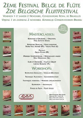 Op 1 en 2 november 2008 stond het 2e Belgische Fluitfestival geprogrammeerd in Brussel. In verband met een soortgelijk festival in hetzelfde weekend te Parijs hebben we besloten dit fetival te verplaatsten naar het weekend van 31 januari en 1 februari 2009. Plaats van handeling blijft het Koninklijk Conservatorium te Brussel. Meer info en aanmelding vanaf 1 oktober op deze website.