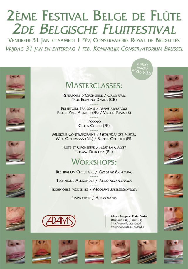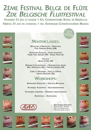 Op zaterdag 31 januari en zondag 1 februari 2009 vindt het 2e Belgische Fluitfestival plaats in het Koninklijk Conservatorium te Brussel. Er vinden tal van Master Classes, Workshops en Concerten plaats met o.a. Pierre-Yves Artaud, Sophie Cherrier, Vicens Prats, Wil Offermans en Paul Edmund-Davies. Le 2ieme festival belge de la flûte se donnera dans les bâtiments du Conservatoire Royal de Bruxelles, ces samedi 31 janvier et dimanche 1er février 2009. Vous pourrez assister à de nombreux workshop, masterclasses et concerts avec, entre autres, Pierre-Yves Artaud, Sophie Cherrier, Vicens Prats, Wil Offermans et Paul Edmund-Davies.
