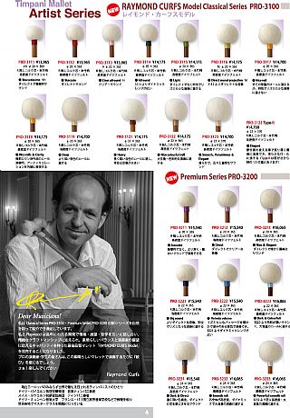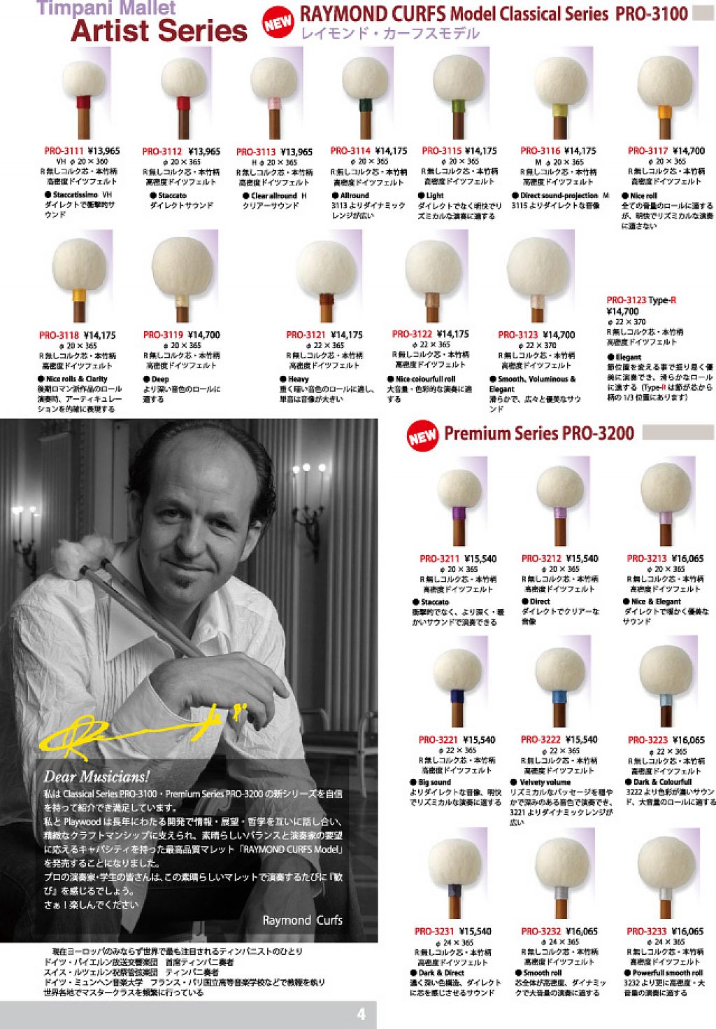 De Nederlandse paukenist Raymond Curfs, solo-paukenist van het Symphonieorchester des Bayerischen Rundfunks, heeft samen met de Japanse firma Playwood een uitgekiende serie paukenstokken ontwikkeld. Vanaf heden hebben wij de complete serie op voorraad en ter introductie bieden wij een korting van 10%.