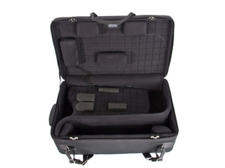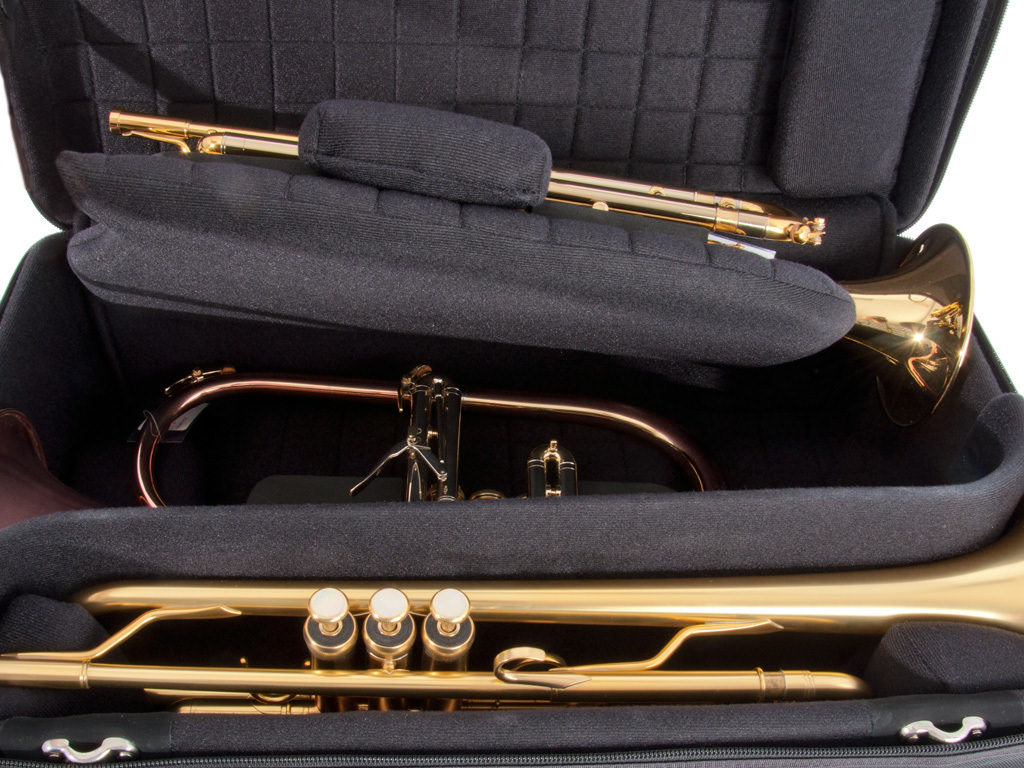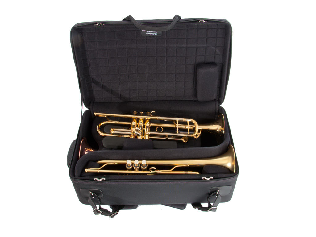 These cases by Marcus Bonna are specifically designed for two trumpets and one flugelhorn. The case is made from a sturdy fiberglass shell covered in durable nylon. The inside is covered with 1cm thick foam and a soft fabric lining. The trumpets and flugelhorn will fit perfectly with the partitions and the modular blocks.