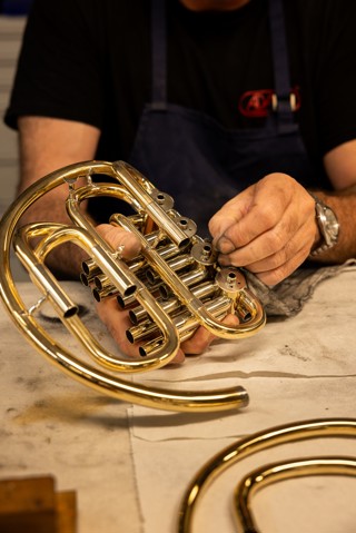 Tijdens dit onderhoud wordt de hoorn zorgvuldig gedemonteerd en ultrasoon gereinigd. De ventielen worden geolied en de buizen krijgen een nieuwe laag vet. Ook controleren we de staat van de veren, cilinders en stootrubbers om ervoor te zorgen dat het instrument soepel blijft spelen.