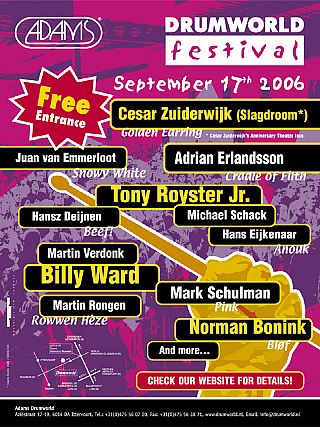 Op zondag 17 september 2006 vond bij Adams Drumworld in Ittervoort het derde Drumworldfestival plaats. En wat een programma had de grootste winkel van de Benelux weer samengesteld! Vanaf 11.00 uur kon je terecht voor vragen en demonstraties van Juan van Emmerloot en Michael Schack. Cesar deed zijn Slagdroom programma, waarna het festival van start ging met een line-up die ronduit spectaculair te noemen was.