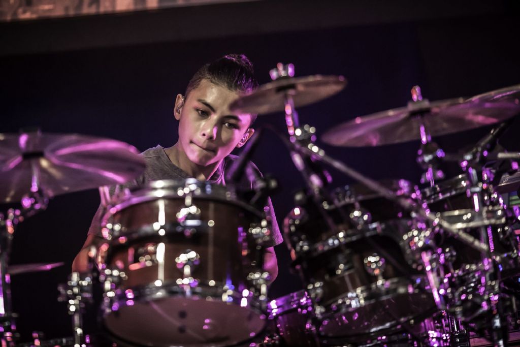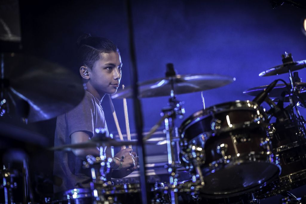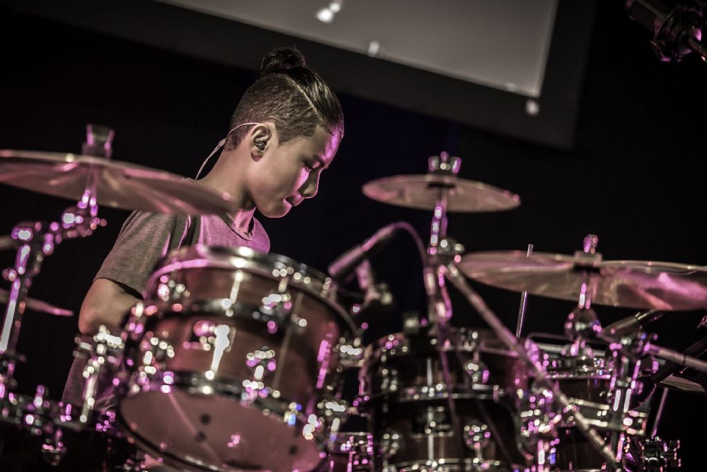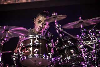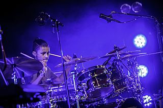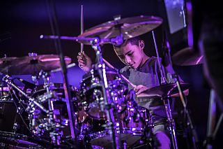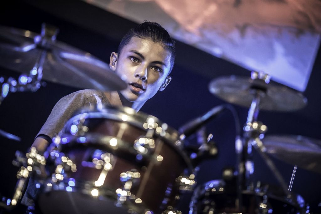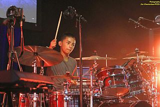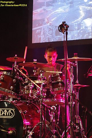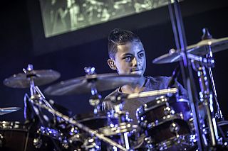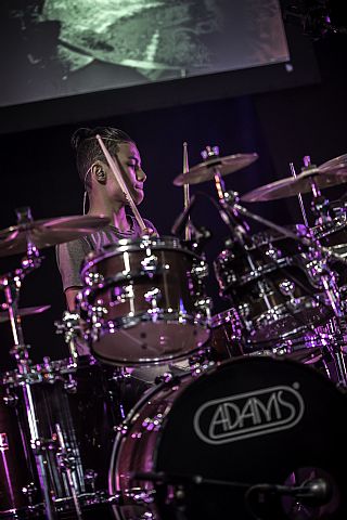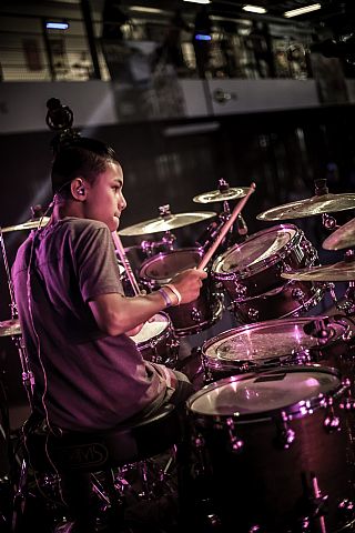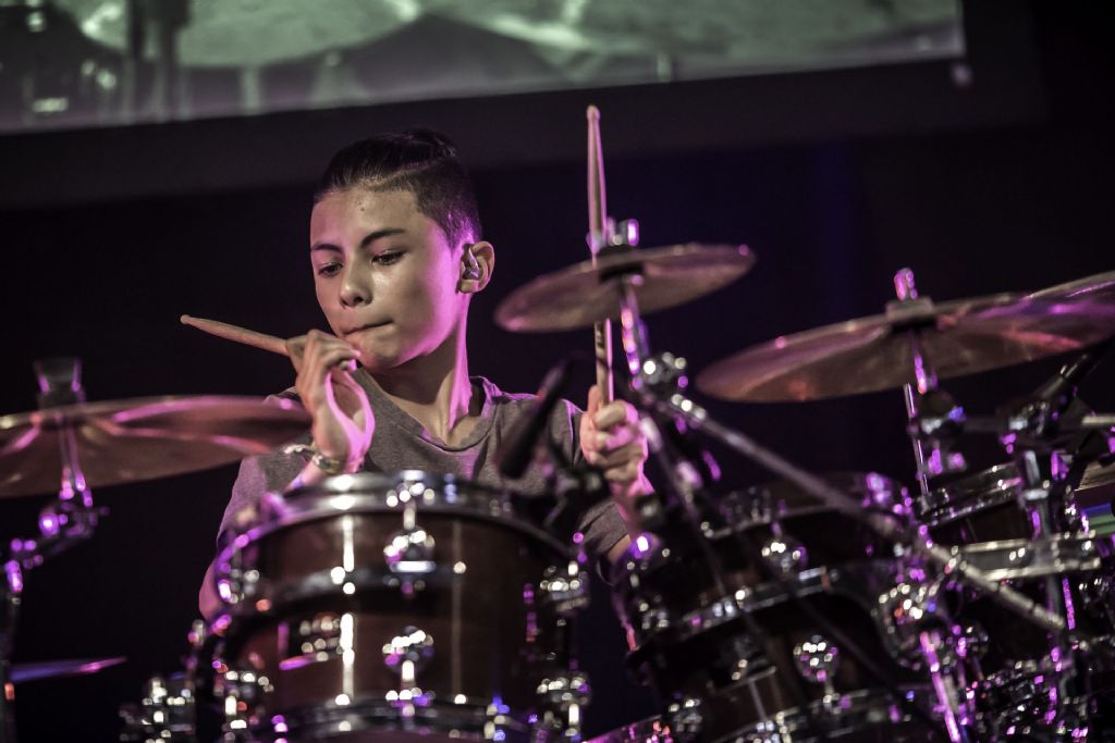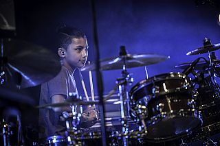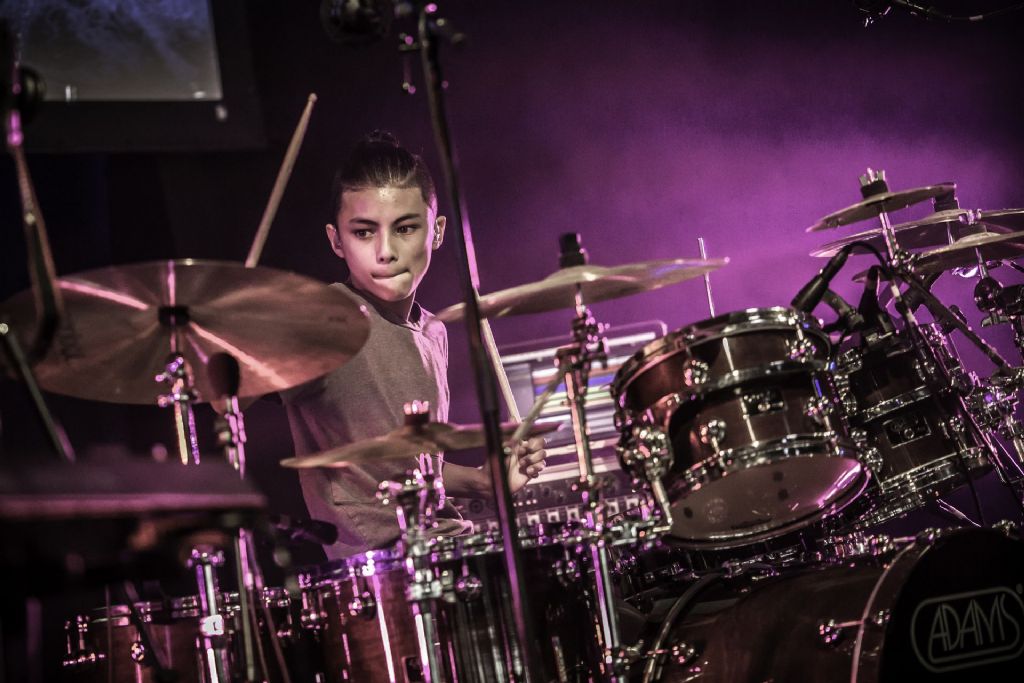 In februari gaf Myron Matitawaer zijn allereerste clinic, op Musicfair in Utrecht. De dertienjarige winnaar van Drumtalent 2015 vond het allemaal misschien wat spannend, maar aan zijn spel was dat bepaald niet te merken. Met veel bravoure en overduidelijk plezier sloeg hij zich door de fusiongetinte gospel- en r&b-tracks, begeleid door ziin vader Stef op toetsen en de onwaarschijnlijk makkelijk spelende bassist Daniel van der Molen. Later in zijn clinic stuurt hij alle volwassenen het publiek in en gaat hij los op een paar getructe begeleidingstracks. Opvallend hoe hij alle accentjes meepakt, met veel rust in zijn time en creatief omgaand met alle verschillende klanken in zijn forse Adams set.
