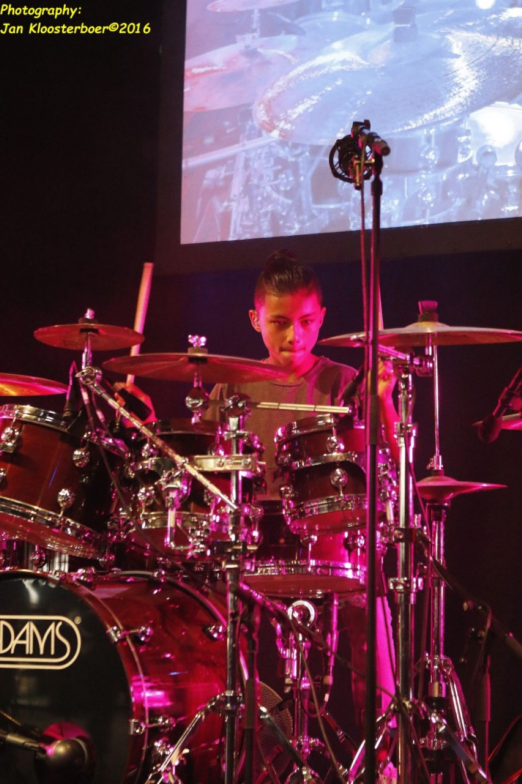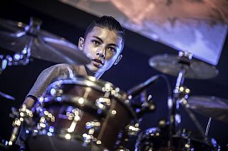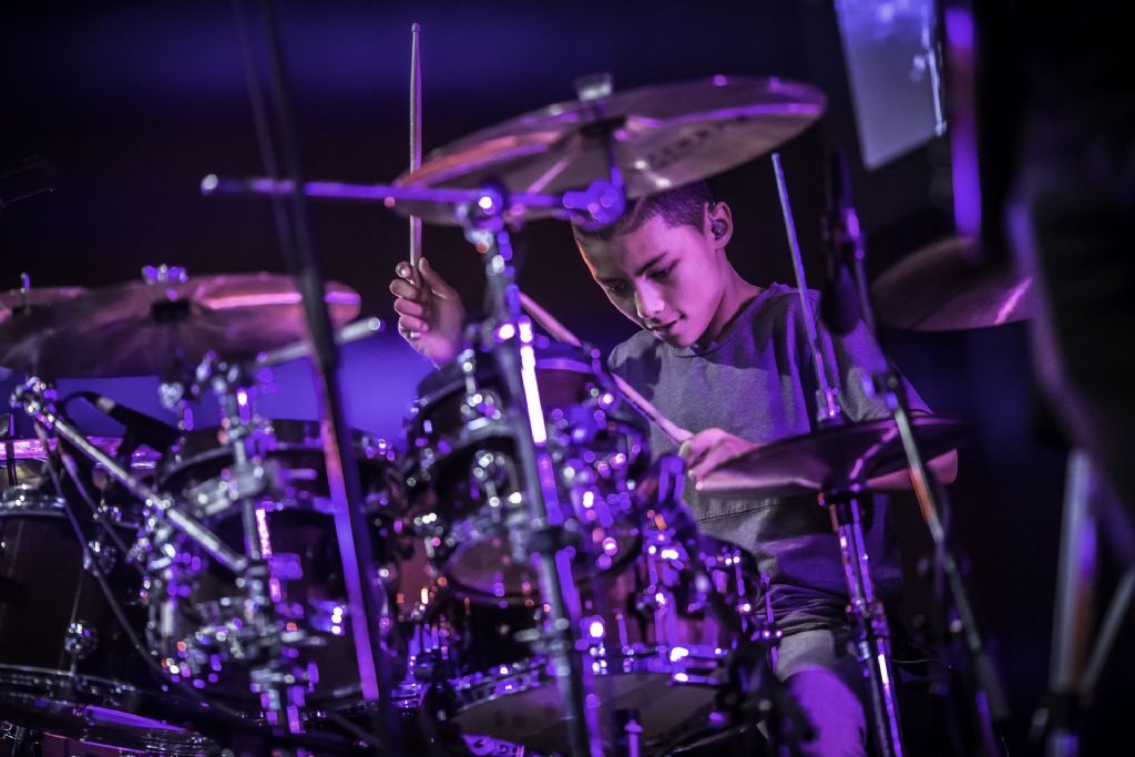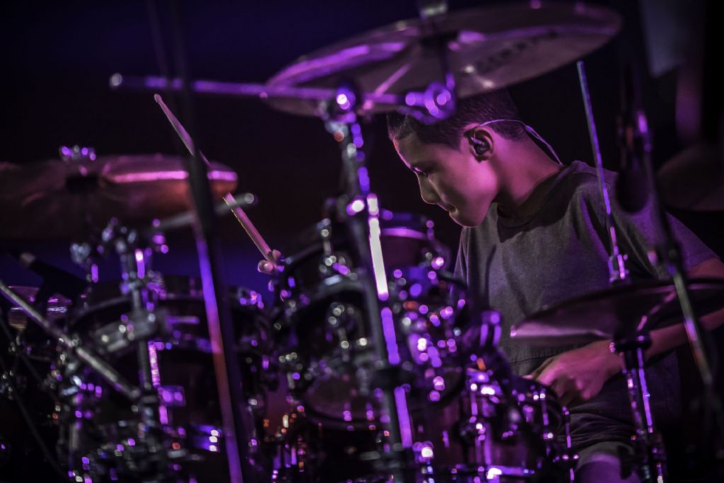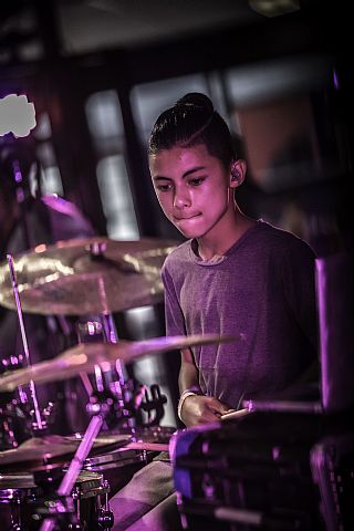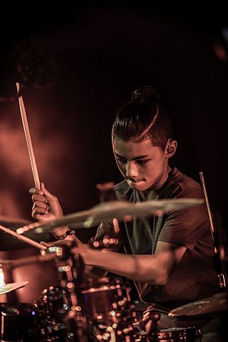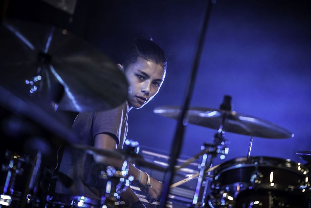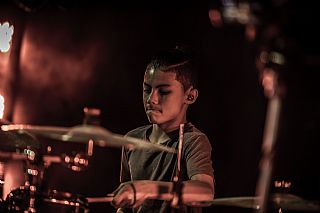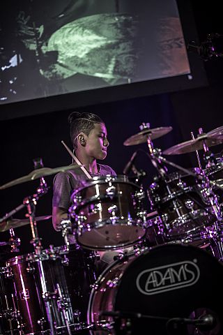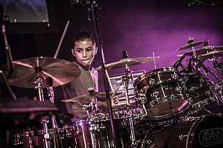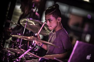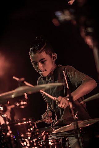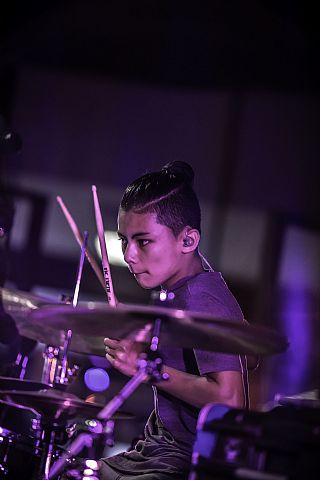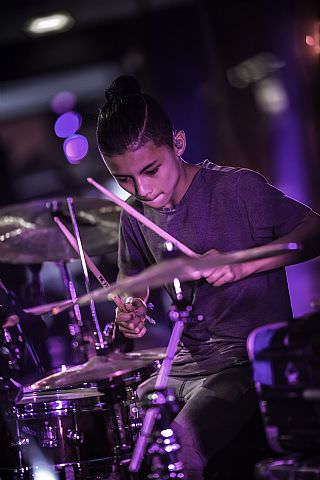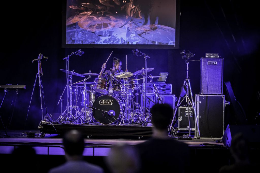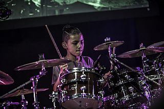 In februari gaf Myron Matitawaer zijn allereerste clinic, op Musicfair in Utrecht. De dertienjarige winnaar van Drumtalent 2015 vond het allemaal misschien wat spannend, maar aan zijn spel was dat bepaald niet te merken. Met veel bravoure en overduidelijk plezier sloeg hij zich door de fusiongetinte gospel- en r&b-tracks, begeleid door ziin vader Stef op toetsen en de onwaarschijnlijk makkelijk spelende bassist Daniel van der Molen. Later in zijn clinic stuurt hij alle volwassenen het publiek in en gaat hij los op een paar getructe begeleidingstracks. Opvallend hoe hij alle accentjes meepakt, met veel rust in zijn time en creatief omgaand met alle verschillende klanken in zijn forse Adams set.