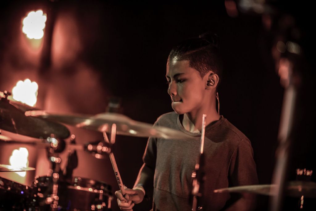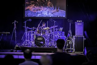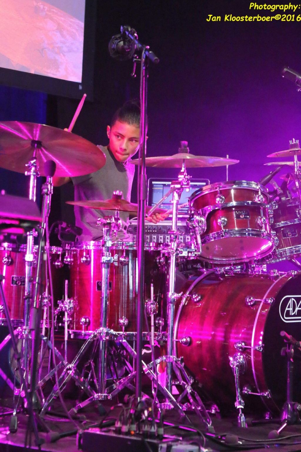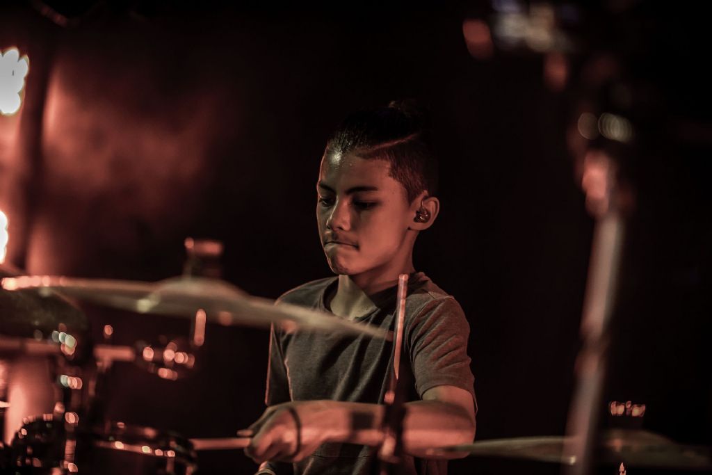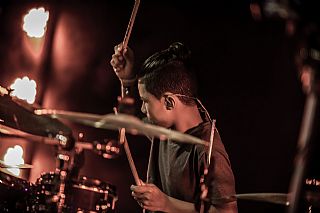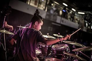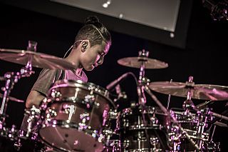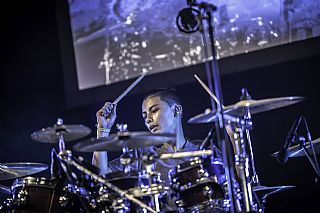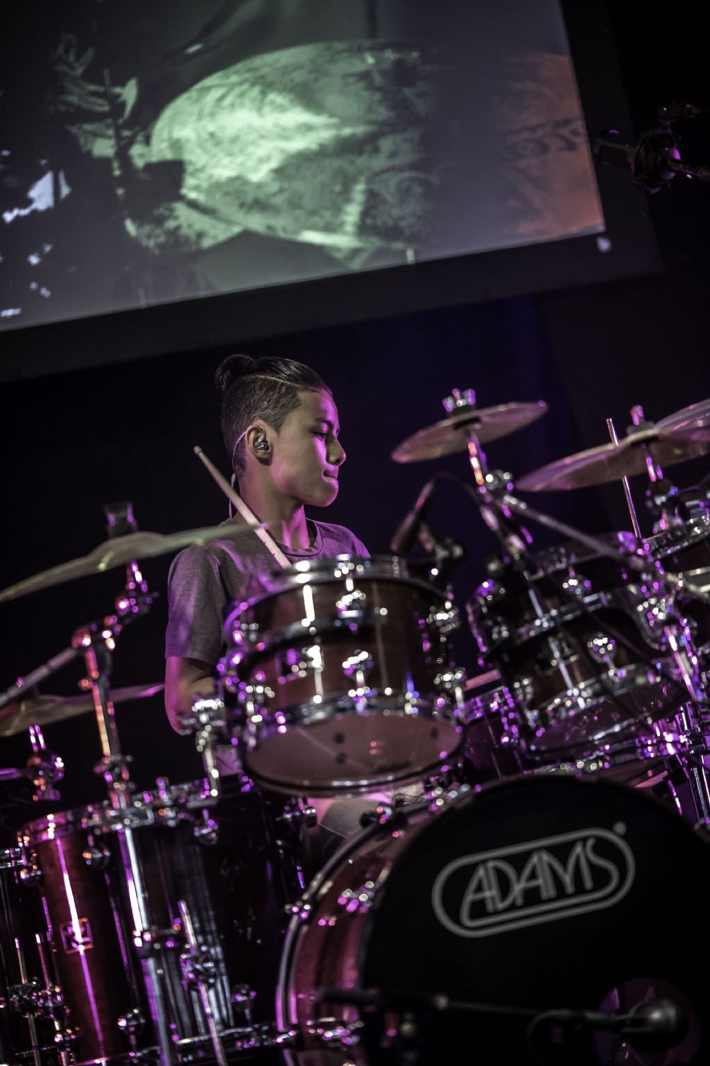 In februari gaf Myron Matitawaer zijn allereerste clinic, op Musicfair in Utrecht. De dertienjarige winnaar van Drumtalent 2015 vond het allemaal misschien wat spannend, maar aan zijn spel was dat bepaald niet te merken. Met veel bravoure en overduidelijk plezier sloeg hij zich door de fusiongetinte gospel- en r&b-tracks, begeleid door ziin vader Stef op toetsen en de onwaarschijnlijk makkelijk spelende bassist Daniel van der Molen. Later in zijn clinic stuurt hij alle volwassenen het publiek in en gaat hij los op een paar getructe begeleidingstracks. Opvallend hoe hij alle accentjes meepakt, met veel rust in zijn time en creatief omgaand met alle verschillende klanken in zijn forse Adams set.