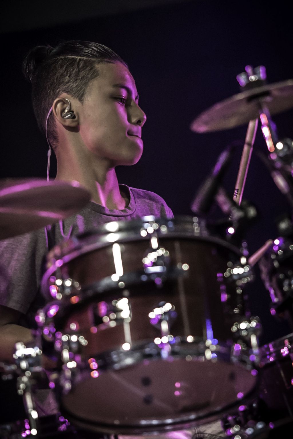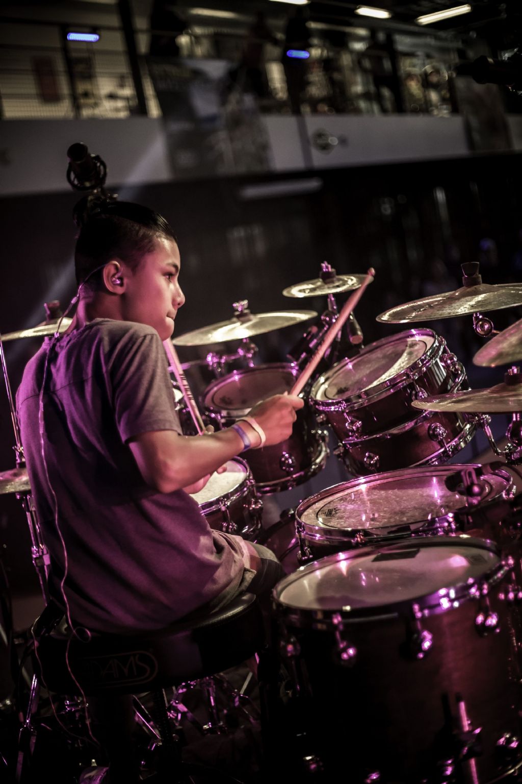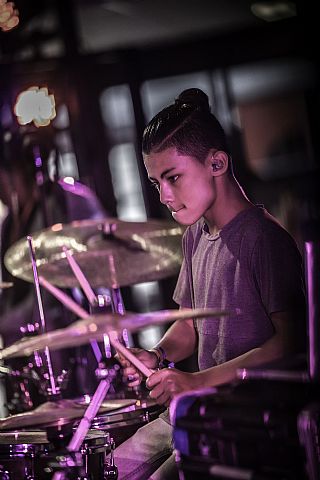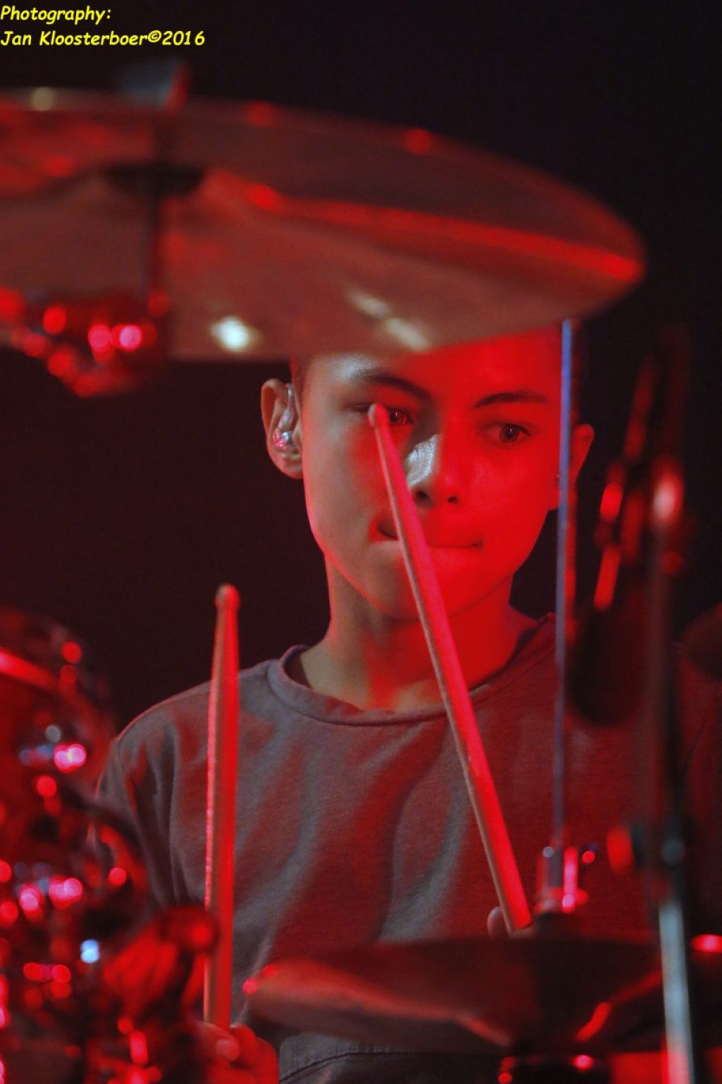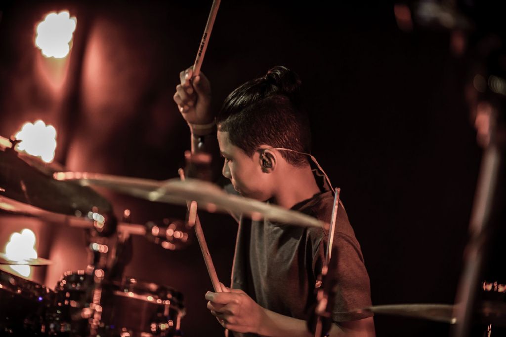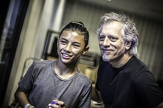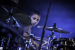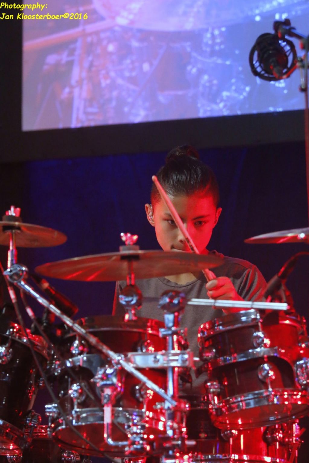 In februari gaf Myron Matitawaer zijn allereerste clinic, op Musicfair in Utrecht. De dertienjarige winnaar van Drumtalent 2015 vond het allemaal misschien wat spannend, maar aan zijn spel was dat bepaald niet te merken. Met veel bravoure en overduidelijk plezier sloeg hij zich door de fusiongetinte gospel- en r&b-tracks, begeleid door ziin vader Stef op toetsen en de onwaarschijnlijk makkelijk spelende bassist Daniel van der Molen. Later in zijn clinic stuurt hij alle volwassenen het publiek in en gaat hij los op een paar getructe begeleidingstracks. Opvallend hoe hij alle accentjes meepakt, met veel rust in zijn time en creatief omgaand met alle verschillende klanken in zijn forse Adams set.