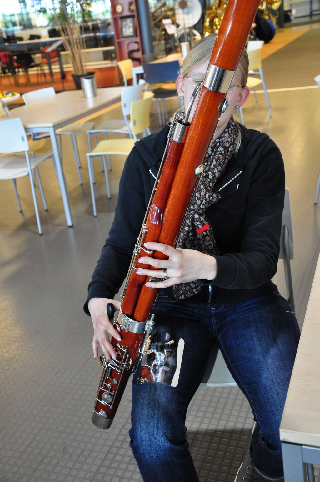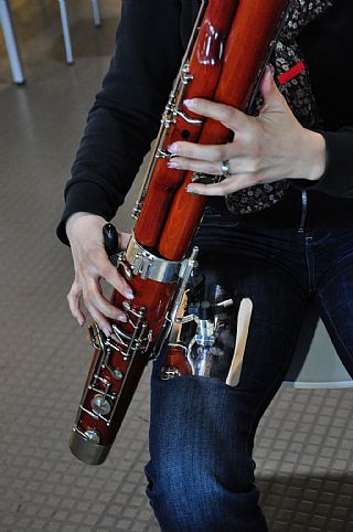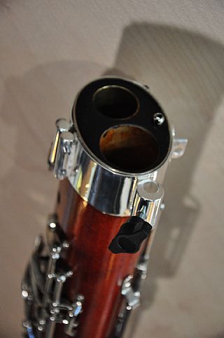 De fagotsteun zit vast op de metalen strip van het onderste gedeelte van de fagot. Deze metalen band zit permanent vast op de fagot. De verstelbare haak en beensteun kunnen telkens voor het spelen door middel van een schroef gedemonteerd worden.