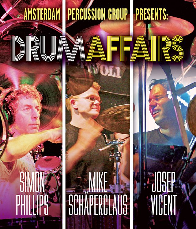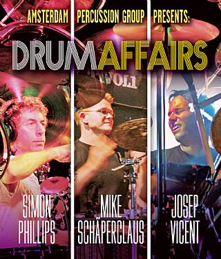 In ‘Drumaffairs’ bundelt de internationale sterdrummer Simon Phillips (o.a. Toto) zijn krachten met de allround percussionisten Mike Schäperclaus en Josep Vicent van de Amsterdam Percussion Group. 30 September jl. werd de try-out gegeven bij Adams Drumworld in Ittervoort.