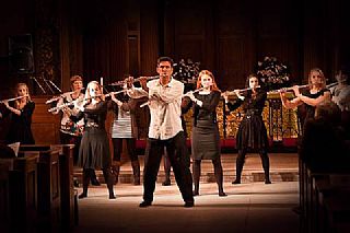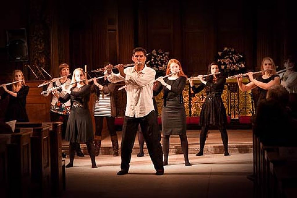 At the start of the piece, the flutists are positioned in the centre of the stage with sufficient space between and around the players and with the flutes already in playing position. Throughout the piece all flutes play in unison."