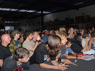 Mel geeft handtekeningen aan eenieder en geeft informatie over de producten.