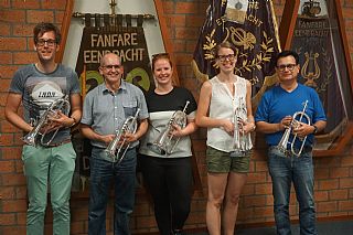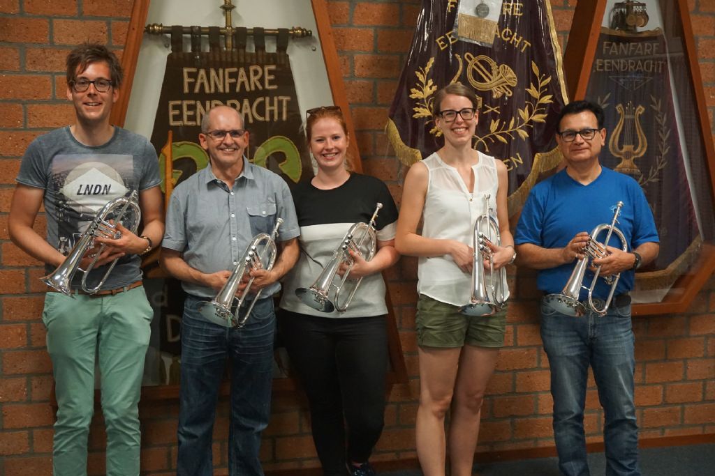 Muzikanten van Fanfare Eendracht Dieteren in hun nopjes met hun nieuwe Adams F1 Bugels.