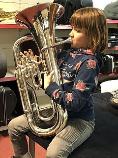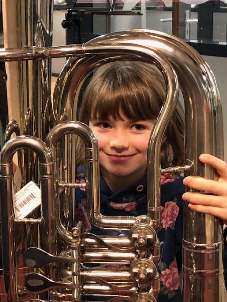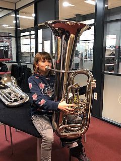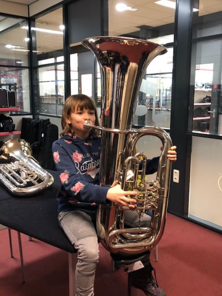 "Ik wil graag bastuba spelen", zei Rebecca (9 jaar) vol enthousiasme. Natuurlijk mocht ze dit van ons even proberen, maar al snel bleek de bastuba een tikkeltje te hoog gegrepen voor deze kleine meid.