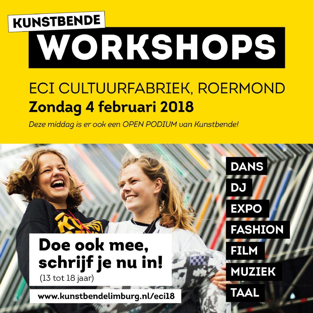 Zondagmiddag 4 februari 2018 organiseert Kunstbende Limburg een Open Podium in ECI Cultuurfabriek. Alle creatieve jongeren tussen de 13 en 18 jaar uit Roermond en omstreken mogen meedoen. Of je nou zelf muziek maakt, dicht, danst of acteert, alles kan en alles mag. Meedoen en komen kijken is gratis, maar Let op: vol is vol. Naast het Open Podium organiseert Kunstbende Limburg ook nog workshops DJ, Dans, Fashion, Film, Expo (beeldende kunst), Muziek en Taal (GRATIS!). Opgeven voor het Open Podium of een van de workshops kan via de website http://www.kunstbendelimburg.nl/eci18/