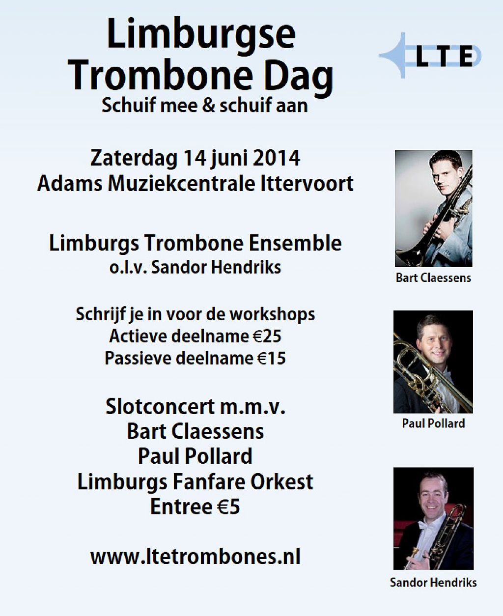 Op zaterdag 14 juni organiseert het Limburgs Trombone Ensemble een heuse trombonedag bij Adams Muziekcentrale in Ittervoort. Op deze dag staa workshops, demonstraties en een concert gepland. De organisatie krijgt medewerking van o.a. Bart Claessens, solotrombonist Koninklijk Concertgebouworkest, Amsterdam, Paul Pollard, Amerikaanse bastrombonist The Met Opera, New York en Sandor Hendriks, 1ste trombonist Philharmonie ZuidNederland.