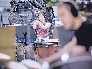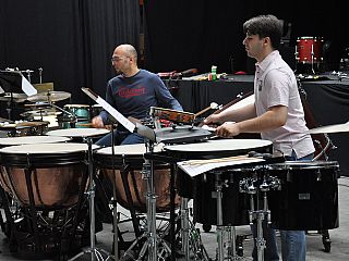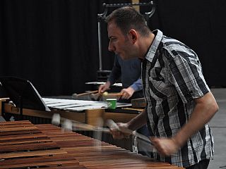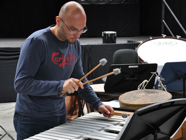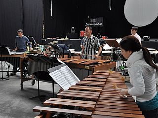 „De muziekcentrale is eigenlijk de enige locatie waar de repetities mogelijk waren, omdat we hier alle instrumenten al hebben staan”, vertelt Adams-directeur Frans Swinkels. Met de Italiaan Filippo Lattanzi heeft hij de slagwerkers bij elkaar gebracht. „Als instrumentenfabrikant onderhouden wij contacten met muzikanten van over de hele wereld.Wij wisten dus wie we hiervoor het best konden benaderen.” Lattanzi vertelt dat hij al sinds september 2008 met het idee rondliep om een internationale percussiegroep op te richten. Toen hij hiervoor gevraagd werd door Fondazione Petruzelli in Bari was hij meteen enthousiast. „De stukken die we spelen, zijn speciaal voor de opening gecomponeerd door Emmanuel Séjournée en Steve Reich. Die zijn niet makkelijk. Iedere muzikant bespeelt verschillende instrumenten in een ander ritme. Iedereen werkt met zijn eigen metronoom om het ritme vast te kunnen houden."