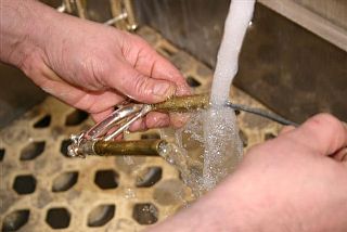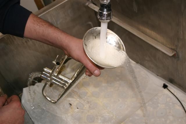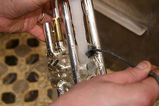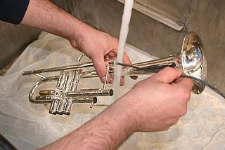 Zoals gezegd dient een instrument regelmatig inwendig schoongemaakt te worden. Eenmaal in de twee maanden kunt u dit doen met lauw-warm water en een beetje vloeibaar reinigingsmiddel. (Gebruik nooit heet of kokend water en/of soda). Leg het instrument een half uur in het water en spoel het daarna goed uit moet schoon, stromend water. (Ook weer zeker niet te heet!). Als u de ventielen reinigt, draait u eerst de ventieldoppen aan de onderkant eraf. Veeg ze vervolgens af met een nietpluizende doek. Voor het reinigen van het ventielhuis kunt u het beste speciale borsteltjes gebruiken. Deze zijn in de handel verkrijgbaar. Vervolgens zet u de ventielen in elkaar en gebruikt u ventielolie om ze weer soepel te laten lopen. Toch zult u na verloop van tijd merken dat u uw instrument niet meer geheel gereinigd krijgt als tevoren. Een speciale ultrasonoor reinigingsbad dat bij Muziekcentrale Adams wordt gebruikt, verwijdert alle kalkaanslag en bijvoorbeeld speekselresten die u niet meer kunt verwijderen door het instrument alleen in het water te leggen en af te spoelen.