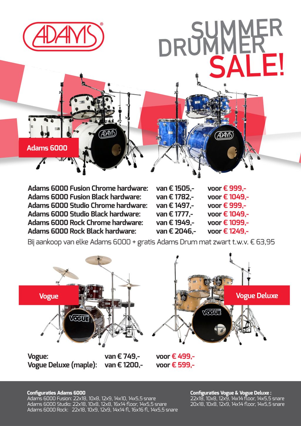 Vogue, Vogue Deluxe en Adams 6000 drums zijn nu zeer voordelig geprijsd! Wees er snel bij want op = op!
