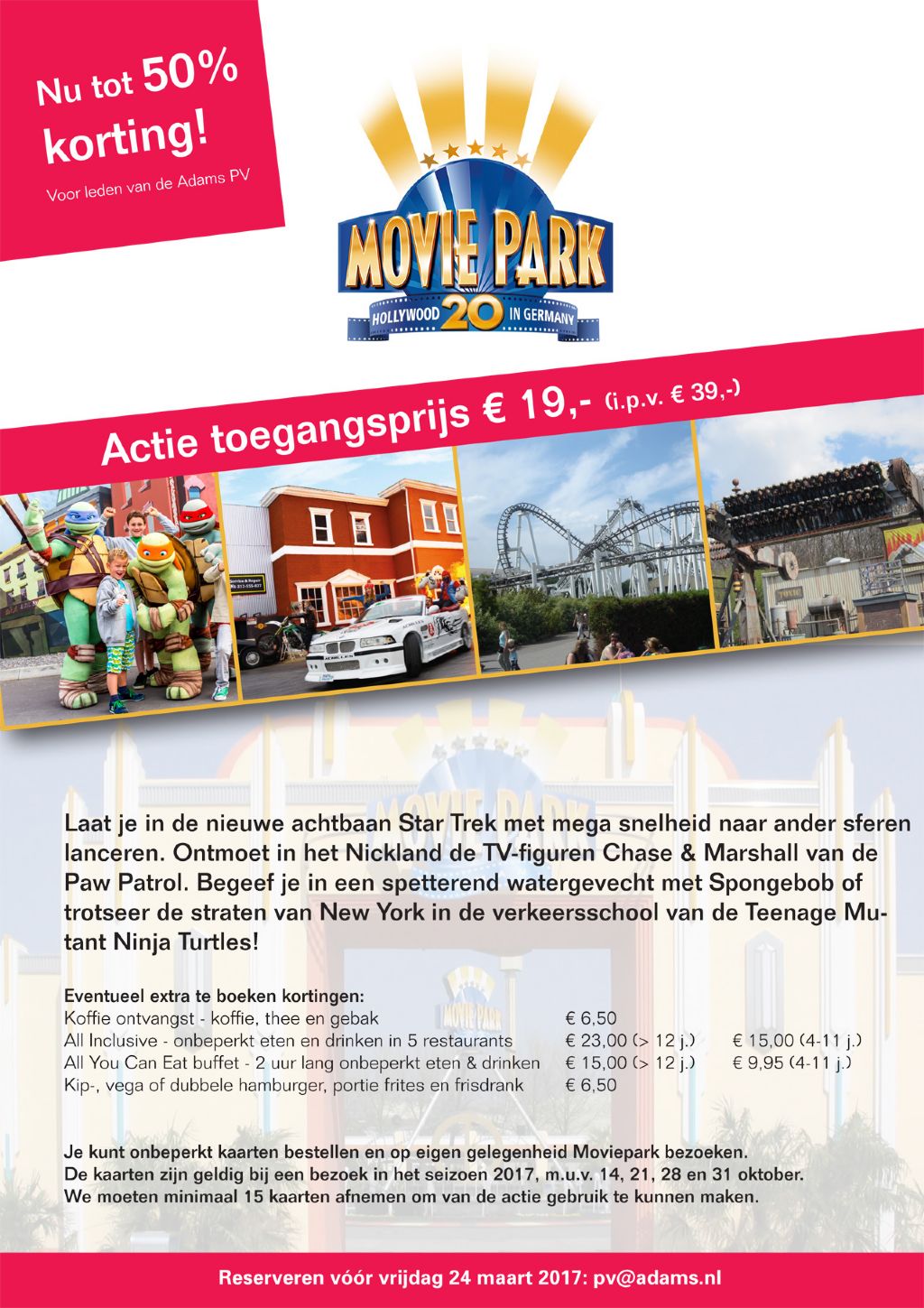 Net over de grens in Duitsland in Bottrop, ligt één van de meest spectaculairste pretparken van Duitsland. Leden van de Adams Personeelsvereniging kunnen voor donderdag 30 maart toegangskaarten voor Moviepark reserveren met flinke korting! De normale prijs voor een kaart aan de kassa van het park is € 39,-. Via deze actie betaal je slechts € 19,-. Je kunt zo veel kaarten bestellen als je wilt en je kunt op eigen gelegenheid Movie Park bezoeken. We hoeven dus niet als groep te gaan.