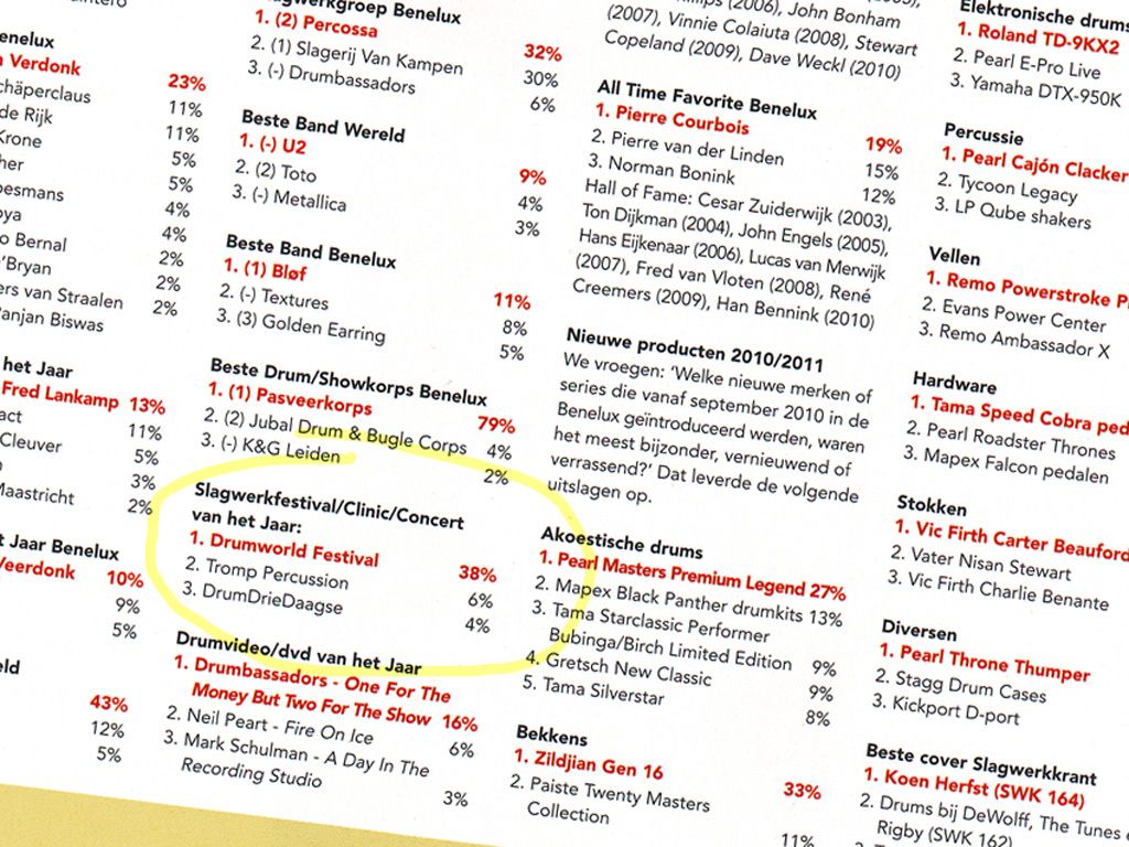 Met 38% van de stemmen (15% meer dan vorig jaar) wordt ons festival dit jaar voor de 4e keer beloond met de hoogste titel. Iets waar we met z'n alle super trots op zijn. Dit is waar we het voor doen! Een festival met drummers voor drummers waar ieder jaar weer naar uitgekeken wordt. Ook dit jaar gaan we er weer een fantastisch feest van maken met alweer een geweldige Line-Up.